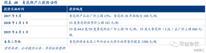 青花郎20年为战略大单品,多次提价对标飞天茅台。2017年7月郎酒发布青花郎大单品战略,将青花郎20年定位于和飞天茅台齐名的中国两大酱香酒品牌之一,在品质和价格档次上对标飞天茅台。此后公司多次提价,2017年5月青花郎20年价格上调约100元,2018年1月,其供货价上调182元,今年6月,其价格上调79元/瓶,且计划在今年内完成两轮提价,将青花郎团购价提至1000元。此外,郎酒表明未来三年内青花郎将分六次将终端价提至1500元。