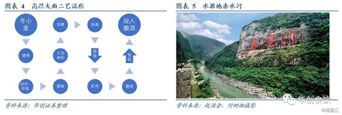 水作为酒的原料之一,其本身的质感和口感也会对酒类的品质产生非常巨大的影响。古人对酿酒用水极为重视,总结出“湛洗必洁,水泉必香”的经验。酱酒的主产区赤水河两岸地质结构特殊,渗水性好,富含各类矿物质及微量元素,使水的口感更加“厚重”,对酱酒丰富的口感层次起到了关键的作用。同时,以茅台为代表的优质酱酒坚持以赤水河水酿造,更适宜仁怀本地微生物种群的繁衍,利于菌种的纯化,稳定酒品质量。
