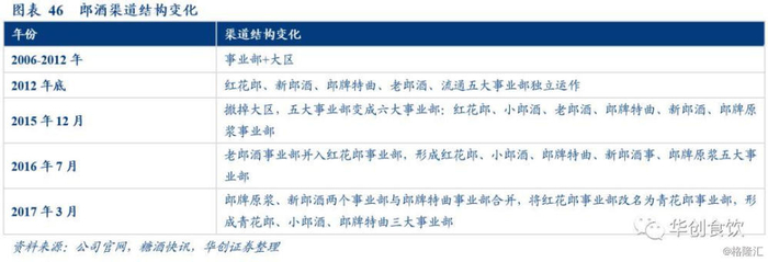 简化渠道架构,成立三大事业部聚焦核心产品。在2012年之前,公司处于快速扩张期,郎酒在渠道上实行“大区+事业部”双轨制,使得其在渠道上尽可能扁平化,有效掌控市场,这种“群狼”模式助推郎酒营收快速突破百亿。但到后期,这种模式弊端逐渐暴露,市场体系开始出现混乱,大区选择性推广产品。2015年年底,郎酒彻底取消大区模式,在事业部上发力,不断简化事业部结构聚焦核心产品,到2017年郎酒最终形成了青花郎(酱香)、郎牌特曲(浓香)、小郎酒(兼香)三大事业部的模式。