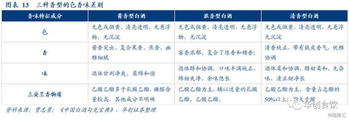 回归白酒产品本身来看,三种香型白酒在色、香、味上的差异,或是形成各香型消费群体、营销模式、主要销售地区差异的主要原因之一。酱香酒中活性物质数量明显多于另外两种香型,故香气更加复杂醇厚,口感粘性大;醛酮类物质:在其他香型白酒中存在较少,被认为是区分酱香型白酒的主要特征之一;糠醛:能赋予酒以异香,沸点高,不易挥发,是酱香酒著名特点“空杯留香久”的主要成因;杂醇油:造成饮后头疼的主要物质,酱酒高温酿造且储藏时间长,含量较少。