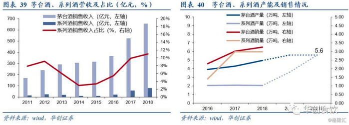 双轮驱动力保千亿,产能扩建保障销量提升。2018年公司总营收为736亿元,全年集团千亿目标有望完成。产能方面,由于核心产区的限制,未来茅台酒产能达到5.6万吨之后将不再增加。李保芳书记提出的茅台酒、系列酒“双轮驱动”战略已初见成效,2015-2018年,系列酒营收从11.1亿增长至80.8亿元,复合增速达94%,同时营收占比稳步提升,从3%增长至11%,公司2019年系列酒目标保持销量3万吨,实现销售额100亿元。产销量方面,2015-2018年,系列酒销量从0.77万吨增长至2.98万吨,为保障系列酒销量稳定增长,公司2018年9月通过3万吨酱香系列酒技改方案,计划未来扩大系列酒产能至5.6万吨,与茅台酒产能达到1:1,真正实现双轮驱动,力保千亿之后稳定发展。