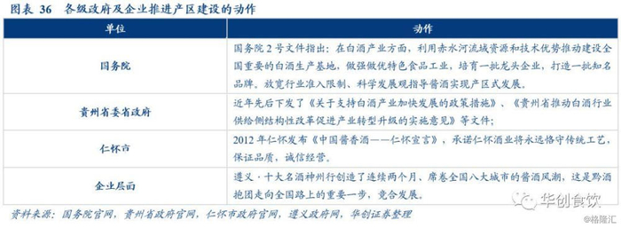 贵州省积极推动做大酱香市场。从产能来看,酱酒产能仅占白酒总量的4%左右,与浓香型相比,仍属于小众香型,仍处于市场培育阶段。龙头茅台强大的品牌力与酱酒较强的口感粘度能更好的拉动中小酱酒企业的发展,使其更好的承接茅台品牌势能释放的红利。对于茅台等知名企业而言,酱香市场的整体发展有利于其品牌影响力的提高,以及在整体白酒行业中的发展,故酱酒产区的发展对于龙头企业和中小企业是一个良性互动的过程。同时由于酱酒的生产周期较长,企业对市场供需关系的预测更加困难,产量规划难度更大,产区建设可以加强酱酒企业间产能调节能力,增强酱酒企业抵御行业波动风险的能力,在抱团抵御产能风险方面,可以尝试销售期酒,设立保护基金在市场遇冷情况下对优质基酒进行回购等措施。