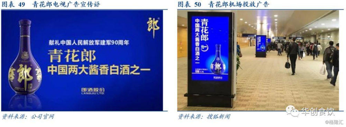 郎酒广告投入大手笔,强化青花郎高端定位。2017年以来郎酒在广告投入上位居行业前列,郎酒负责人曾表示从2017年下半年开始,郎酒要在5年投入100亿元进行宣传,在中国的高铁和飞机5分钟以内要有一次郎酒广告的出现。高铁、飞机是商务差旅的主要交通工具,涵盖郎酒的主要消费群体,符合青花郎高端商品精品酒的定位。除此之外青花郎还以央视国家战略品牌计划亮相主流媒体,积极赞助央视各大节目、活动版块,让“青花郎,中国两大酱香白酒之一”的广告语多次呈现在消费者面前。