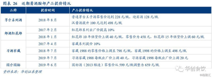 大单品战略效果显著,腰部产品量价齐增。当前是酱酒行业二次扩容的黄金时期,各个品牌的高速发展均离不开大单品的支撑,除飞天茅台外,郎酒青花郎未来有望进入百亿单品俱乐部;从19上半年来看,茅台王子酒销售额突破24亿,习酒窖藏系列营收占比计划要超过50%,意味着王子酒与窖藏系列均有望成为50亿级大单品;红花郎体量接近20亿级;国台国标将成为10亿级体量单品,逐步形成完整的大单品梯队,市场结构更加清晰。同时郎酒习酒国台均有上市计划,品牌影响力有望进一步提升;金沙酒18年开始产品结构从中低端向中高端的转型;国台将国标的价格体系上移;茅台拉开价格空间后,腰部产品纷纷顺势提价,配合销量的增长,给腰部次高端市场带来较大的增量。