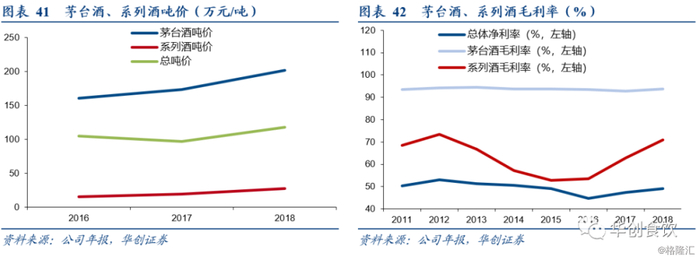 吨价提升明显,盈利能力不断增强。2014年,茅台集团将旗下汉酱、仁酒、王子酒及迎宾酒等系列酒剥离出来独立运营,2017年提出“133”品牌战略——打造1个世界级核心品牌(茅台)、3个全国性知名品牌(茅台王子酒、迎宾酒、赖茅)及3个区域性重点品牌(汉酱、仁酒、贵州大曲),全力打造大茅台品牌集群,优化系列酒产品结构,效果显著。2015-2018年系列酒吨价从16.8万元/吨提升至29.6万元/吨,提升幅度达76.2%;18年量平价增,向大单品聚焦,结构升级:茅台王子酒单品销售额超38亿,赖茅和贵州大曲两大单品首次突破10亿。同期系列酒毛利率从52.9%提升至71.1%,提升幅度达18.2pcts,盈利能力显著提升。同期茅台酒方面,吨价从160.2万元/吨提升到201.7万元/吨,主要是由于飞天提价、非标投放增加等手段综合作用的结果,毛利率则一直稳定在90%以上的高水平。