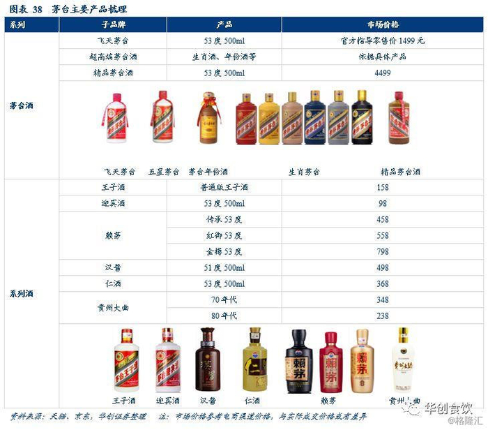 产品结构清晰,价格体系完整。公司酱酒产品可分为两大类:茅台酒和系列酒。茅台酒中,除了核心大单品飞天茅台,还包括一系列超高端产品,如年份酒、生肖酒、礼盒酒、纪念酒等,超高端非标系列产量有限,定价较高,具有较高收藏价值。系列酒主要包括王子酒、迎宾酒、赖茅、仁酒、汉酱、贵州大曲等品牌,价格定位以中高端为主。系列酒中,普通版王子酒为推出最早、体量最大的单品,2018年销售额为38亿元,为系列酒第一大品牌。赖茅、汉酱、贵州大曲定位次高端价格带,2018年销售额均超10亿。迎宾酒为系列酒定位低端大众市场的产品,采用大曲、麸曲混合生产,53度产品价格在100元左右。