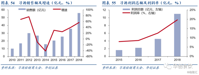 全国化战略稳步推进,省外市场营收已超省内。在市场开发方面,习酒实施“132”全国市场布局,即打造一个根本市场(贵州),三个样板市场(河南、山东、广东),两条经济带(长江经济带、沿海经济带)。经过近三年的省外市场耕耘,习酒全国化成效显著,2016年习酒贵州市场收入占比在60%以上,2018年贵州市场营收同比增长19.20%,而省外市场同比增长188.36%,省外营收占比达55.66%,至目前,其省外市场占比已达64%,且年底可能实现70%,初步实现了从区域性品牌向全国性品牌的转变。