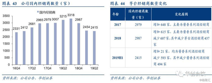 系列酒“5+5”市场战略,着力优化经销商体系。2016年,酱香系列酒首次提出打造“5+5”市场战略,即聚焦五大核心市场:河南、山东、贵州、北京、广东;打造五大潜力市场:江苏、浙江、上海、天津、河北。该战略实施后,核心市场的系列酒销售成绩亮眼,如战略核心产品茅台王子酒2017年在山东市场销售量达870吨,实现同比增长335%。在大力推进市场布局的同时,茅台集团着力优化系列酒营销网络,一方面吸收优质经销商,一方面调整无资源和市场网络优势的经销商,增强系列酒经销商整体实力,2019H1系列酒经销商减少494家,说明系列酒需要稳固市场,消化库存,但盈利水平则显著提升。