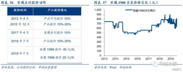 窖藏1988为公司大单品,多次提价助推吨价提升。窖藏1988是习酒公司2010年推出的战略大单品,由1988年的老酒和窖藏8年以上的基酒勾兑而成,九年来为习酒创造了103亿销售额。2018年,习酒营收为56亿,其中窖藏系列销售为28.3亿,占比超过50%,主要由窖藏1988贡献。近年来,窖藏1988多次提价,不断巩固其次高端地位。2017年4月,窖藏系列出厂价提升10%;2018年7月,窖藏系列提价10-20%;2019年7月,窖藏系列全线提价,其中窖藏1988上涨40元/瓶。多次提价使得窖藏系列吨价显著提升,2018年其吨价为18.7万元,同比增长16.25%,2019年习酒目标吨价为22万元。