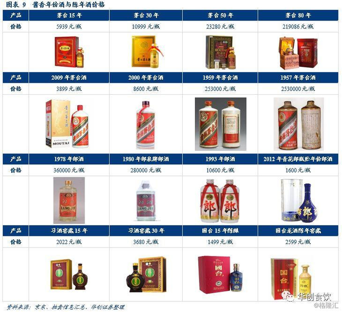 酱香年份酒、陈年酒的稀缺性与投资属性分析:首先区分两个概念,年份酒是使用窖藏达到一定年份的基酒,与不同年份、轮次的基酒勾调而成;陈年酒则是已经完成了生产,再经过较长时间存放的老酒。若将两者对比,经过精心调制的年份酒在口感上更胜一筹。无论是年份酒还是陈年酒,经过时间的沉淀,酒香都会愈加浓郁,酒体更加柔和,深受消费者的喜爱。加之酱香酒产能有限,经过时间沉淀的老酒更加稀少,稀缺性和收藏属性得以凸显。不管是茅台年份酒价格高昂仍一瓶难求,还是郎酒老酒拍卖屡创新高,都体现了近年酱香老酒市场热度的不断上升。酱香型白酒老酒市场火热,价格不断攀升,也为各酱酒品牌拉开了足够的价格空间,同时也能作为先行指标,反映出酱香行业良好发展趋势。