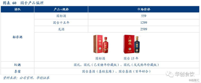 国台酱酒产品主要包括标准酒、坛酒、喜宴、礼盒四个系列。标准酒是国台的核心系列产品,其中国标酒为第一大单品,价格在550元左右,国台十五年、龙酒作为超高端主力产品定价在千元及以上。此外,国台坛酒系列为大容量藏酒系列,价格高,非主线产品。喜宴两款产品则瞄准地区性大众婚宴市场。今年春糖期间国台推出新品礼盒装国台酱酒,定价399元,瞄准升级后的大众消费市场。