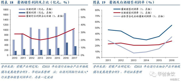 利润增长明显,占比不断提升。据前瞻产业研究数据显示,2010-2017年间,除13、14年受整体行业影响利润下滑外,其他年份均有不俗表现。近年来受茅台吨价总体上升、郎酒习酒等头部企业纷纷提价等影响,酱香型白酒行业利润增速明显加快。据左右脑咨询机构估计,2018年酱酒行业净利润约430亿-440亿左右,占白酒整体利润的35%左右。利润率方面,由于茅台强大的盈利能力,酱香型白酒利润率高于白酒行业整体水平,剔除贵州茅台后酱酒行业利润率有明显下降,也说明酱香酒行业整体盈利能力仍有较大提升空间。