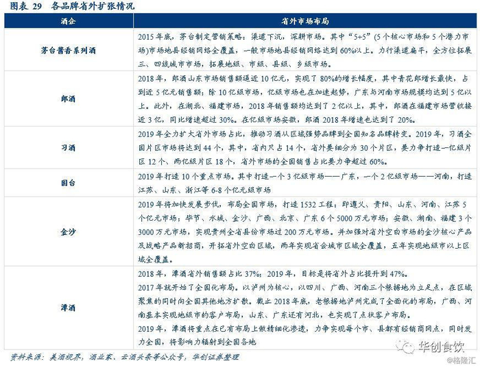 根据地稳增长,潜力市场求突破,渠道扁平化助力品牌全国化。近年各大酱酒品牌快速发展,纷纷发力省外市场,如茅台系列酒的“5+5”战略,习酒的“132”战略,均在要求保证根据地市场稳步增长的同时,在省外潜力市场寻求突破。茅台系列酒过去几年发展迅速,过亿的板块市场已达到10个以上;习酒郎酒在山东、广东、河南等市场增速较快,取得了不错的成绩;习酒2019H1营收41亿元,省外占比高达64%;酱酒品牌纷纷加大省外招商力度,专注渠道下沉,加之线上渠道的发展,渠道扁平化趋势明显,将更利于酱香品类的推广发展,助力酱酒品牌从地域性向全国性的转变。