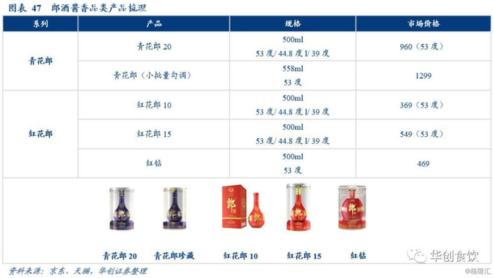 产品结构丰富,价格体系完整。青花郎事业部经营郎酒酱香类品类,旗下拥有四个产品系列:红花郎、青花郎、奢香藏品以及年份纪念酒。青花郎20年是郎酒拉动产品升级的拳头产品,定位于高端商务用酒,当前价格在1000元左右,今年5月郎酒宣布青花郎20年将在三年内分六次提价至1500元,继续冲击超高端。红花郎为郎酒定位次高端酱酒市场的大单品,多为大众喜宴用酒,红花郎10年、15年当前价格分别为369元、549元。奢香藏品为具有收藏价值的超高端酱酒,主要包括青云郎、红运郎、连年有鱼等产品。此外,郎酒还推出了部分年份纪念酒。