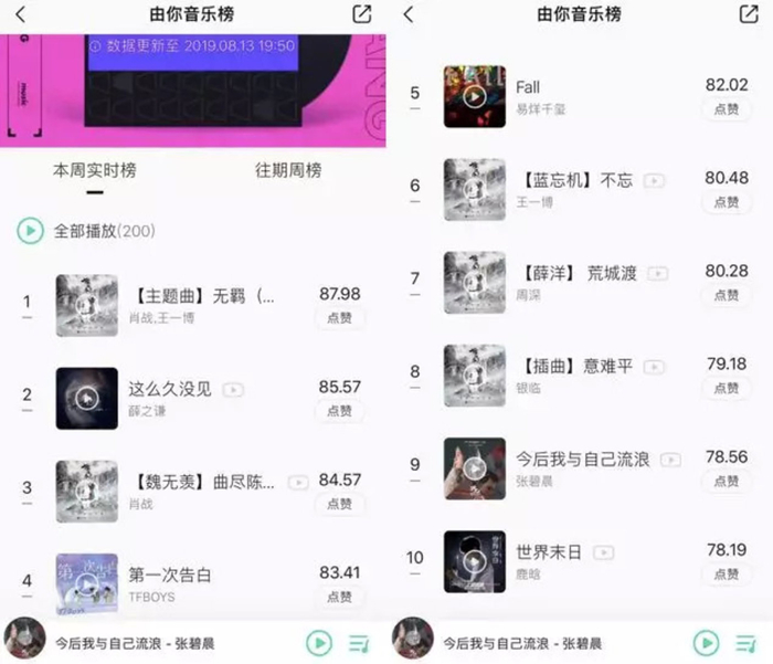在回答这个问题之前,我们可以先看一些数据。以当下收集了最大听歌用户数据的由你音乐榜来看(由你音乐榜数据取自QQ音乐、酷狗音乐、酷我音乐三大数字音乐平台),最新一周的Top10作品中,涉及到两位solo歌手出身的艺人,但只有薛之谦是个人作品上榜,而张碧晨的上榜歌曲则是《哪吒之魔童降世》的片尾曲,其他上榜作品则不是影视剧OST就是偶像新歌;