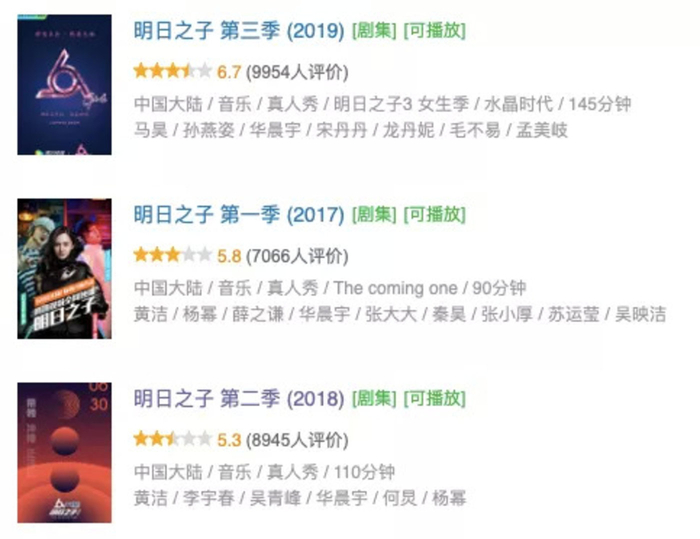 作为一档走到第三季的节目,《水晶时代》有不少需要面对的挑战。首先在口碑上,《明日之子》系列似乎一直没能得到多少文艺青年的认可,在豆瓣上的评分,第一季仅有5.8分,第二季5.3分,如今的第三季截至目前达到了及格线6.7分,虽然有上涨趋势,但不得不说口碑方面仍不够优秀。而且有意思的是,单以今年暑期档上线的网络综艺豆瓣评分来看,也只有《明日之子》系列参评人数从未超过1万。