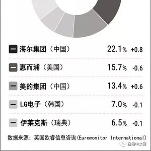 海尔的榜首地位没有动摇,份额为22.1%,同比提高0.8个百分点。惠而浦占15.7%,美的占13.4%,LG电子占7.0%,伊莱克斯占6.5%。