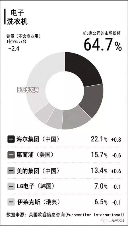 海尔从大型洗衣机到小型洗衣机推出广泛产品,借助贴近消费者细致需求的产品线扩大销售额。海尔与美的一起,份额均比上年小幅增长,惠而浦下降0.6个百分点。有分析认为,原因是中国企业相继进驻了洗衣机需求旺盛的东南亚市场。