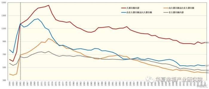 60年代中期以来,大都市圈内部流动成为日本人口流动的主要形式。从1954-2017年日本人口流动态势来看,60年代中期之前,非大都市圈向大都市圈人口流动占据主体,大都市圈内部人口流动次之;之后,情况发生变化,大都市圈内部人口流动占据主体,从非大都市圈向大都市圈的人口流动开始放缓。截至2017年,大都市圈内部流动占比39%,非大都市圈流向大都市圈流动占比23%,大都市圈流向非大都市圈流动占比18%,非大都市圈内部流动占比20%。总体来看,非大都市圈向大都市圈人口流动先强后弱,而大都市圈间及大都市圈内部流动成为中后期人口流动主体形态。