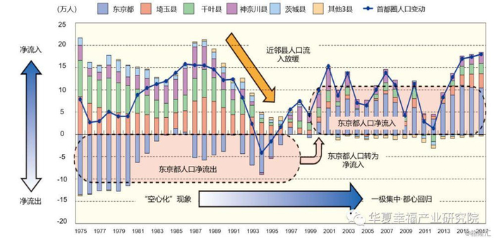 东京都市圈人口大规模郊区化时代基本终结,“都心回归”现象突出。从1975-2017年首都圈分区县人口净流入情况来看,1975-1995年间,东京都人口持续净流出,呈现明显“空心化”趋势,此时近邻县人口快速增长,出现人口大规模净流入;90年代中期以来,东京都人口由净流出转为净流入,近邻县人口流入开始放缓,“都心回归”趋势明显。