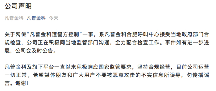 8月15日,凡普金科发布声明称,关于网传”凡普金科遭警方控制”一事,系凡普金科合肥呼叫中心接受当地政府部门合规检查。