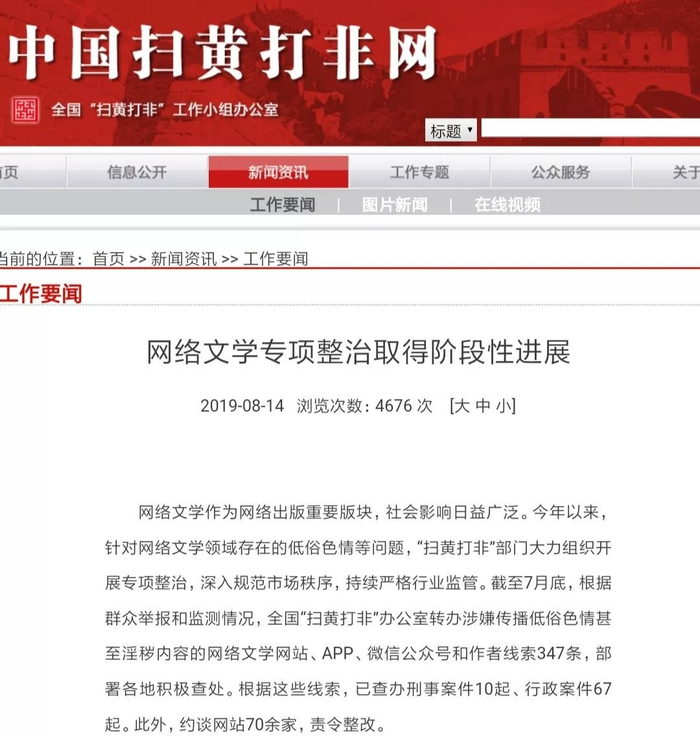 此外,约谈网站70余家,责令整改。其中,包括“红袖添香”“17K中文网”“豆瓣网”“新浪微博”“磨铁中文网”等多个网站因传播淫秽色情小说被查处。