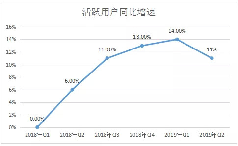 2018年Q2-2019年Q1,用户同比增速分别为6%,11%,13%,14%,11%。总体上是呈上扬趋势,但本季度同比11%的同比增速与上期数据相比,仍显疲弱。