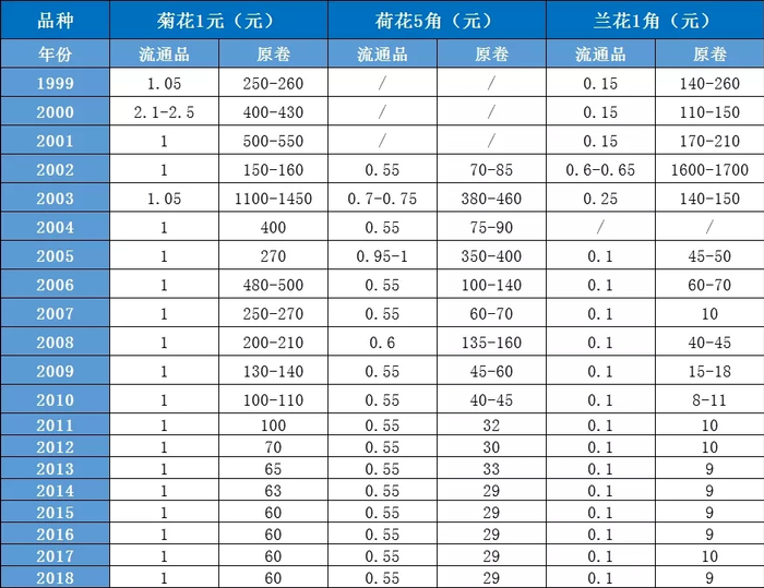 大家手里有的钢镚,主要还是老三花(牡丹1元、梅花5角、菊花1角)、新三花(菊花1元、荷花5角、兰花1角)中的普通年份,一些特殊年份的硬币存世量少,大家很少会有。