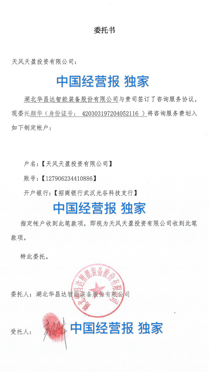 本报记者掌握的证据还显示,华昌达向颜华下达了《委托书》,委托颜华将咨询顾问费划入天沣天盈在招商银行武汉光谷科技支行开设的公司账户。该《委托书》盖有华昌达公章及受托人颜华签名及手印。