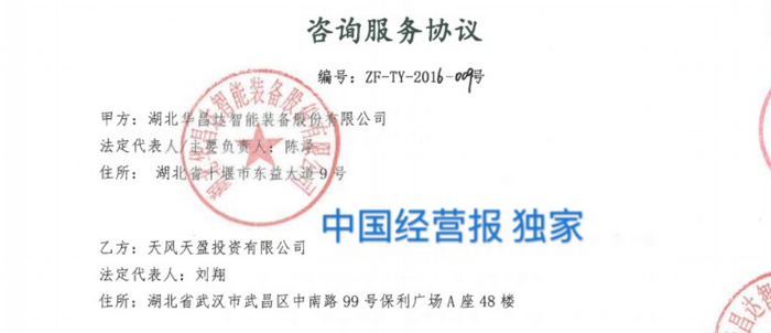 不过,《中国经营报》记者独家掌握的相关证据显示,华昌达在2016年确曾与天沣天盈(曾用名“天风天盈投资有限公司”,2018年2月变更为“天沣天盈”)签署有《咨询服务协议》(编号:ZF-TY-2016-009号),并向公司原实际控制人兼董事长颜华下达了《委托书》,委托颜华将咨询服务费划入天沣天盈账户。