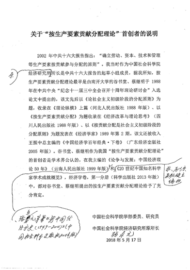 1. 社会主义初级阶段分配原则是按生产要素贡献分配,这一观点是蔡继明和谷书堂教授于1988年在其学术论文《论社会主义初级阶段的分配原则》首次提出的。该文获中宣部、中央党校、中国社会科学院纪念十一届三中全会召开10周年入选论文奖,蔡继明和谷书堂教授作为我国按生产要素贡献分配理论的首,在张卓元教授主编的《论争与发展:中国经济理论50年》中、柳欣教授主编的《中国经济学30年》、陈东琪教授主编的《中国经济学史纲(1900-2000)》,张卓元等主编的《20世纪中国知名科学家学术成就概览(经济学卷 第一分册》、吴太昌等主编的《影响新中国60年经济建设的100位经济学家》中,均给予了肯定。王振中教授还将那篇获奖论文收入其主编的《中国经济学百年经典·下卷:1979—2000》(广东经济出版社2005年版)。
