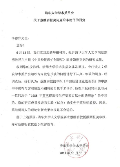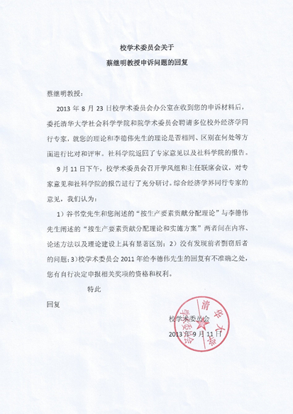 清华大学学术委员会两次相关回复(信件一的附件1,信件二的附件3、附件4):