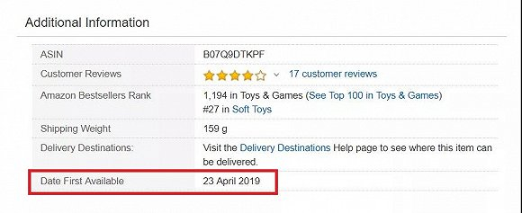 下面这张图,是迪士尼官方授权的叉叉毛绒玩偶在亚马逊上的产品信息,可以看到这个玩具是2019年4月23日上架的。