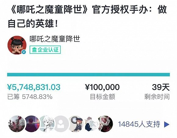 《哪吒》官方授权手办众筹到第5天,金额就超过500万元了。截至发稿,有1.48万人参与众筹,金额超过了570万元。