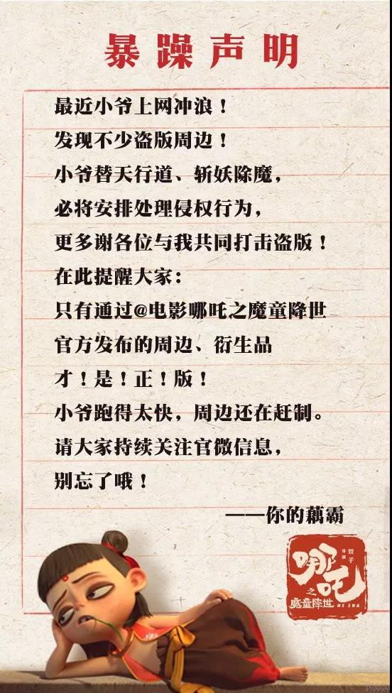 7月26日,在电影上映当天,《哪吒》官方微博就发布了一则“打击盗版周边”的声明。