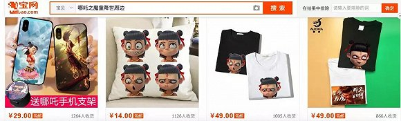这则声明背后,是在某宝泛滥的,未经授权的盗版”哪吒“T恤、手机壳、帽衫、抱枕、挂件。单款价格从20元到299元不等,包邮。