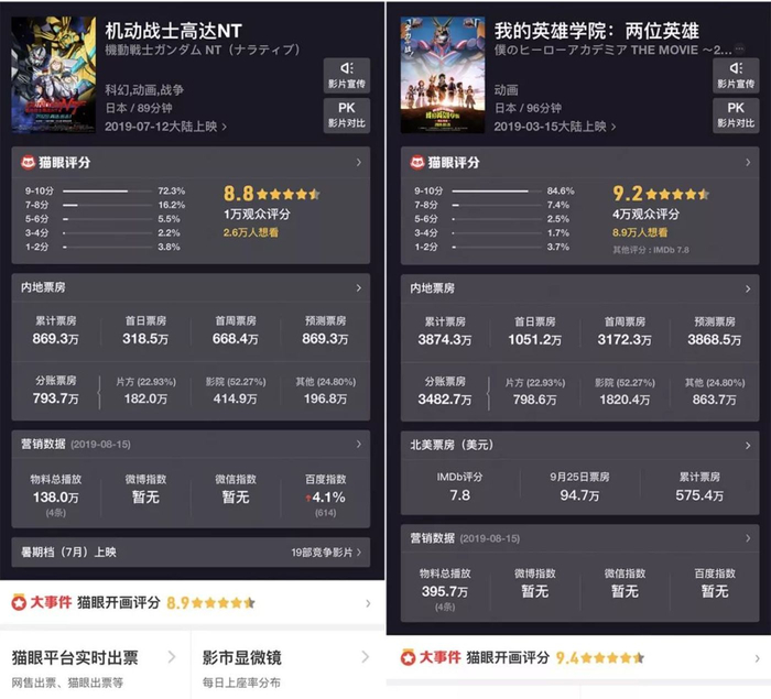 和《我的英雄学院:两位英雄》等近期上映的动画作品比起来,《机动战士高达 NT》的票房表现还是有着很大的差距。从猫眼电影公布的数据看来,《机动战士高达 NT》的场均人次数据偏低,那意味着它是一部面向专属人群的粉丝向作品。
