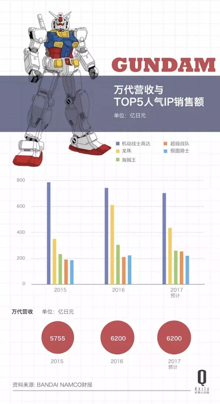 直到 2017 年年初,GUNPLA 高达塑胶模型已经累计售出 4.73 亿个。而从万代公布的 2016 年财报来看,万代销售额的 11.98% 由高达系列贡献,比《龙珠》、《海贼王》等知名的长篇作品更能赚钱。这些数字不仅是彰显着万代销售策略的成功,同时也能表现高达这个 IP 结合产品的吸金能力。