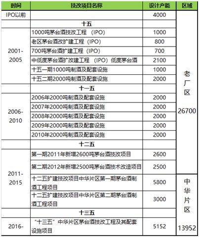 十一五期间,公司启动万吨茅台技改项目,分五年每年建设2000吨产能,设计产能共计10000吨/年(老厂区);