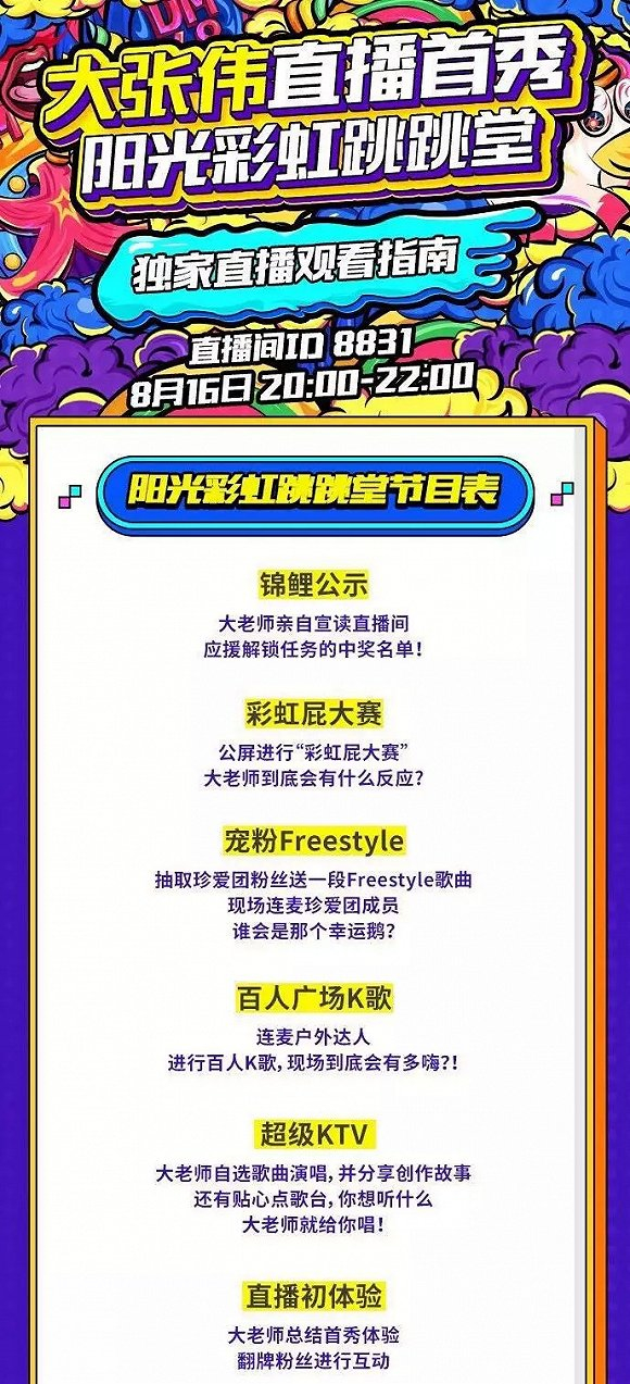 在大张伟的YY直播首秀中,特定设计了应援解锁任务中奖的锦鲤公示,考验押韵功底的彩虹屁大赛,随机抽取幸运粉丝连麦、为其当场写歌的宠粉Freestyle,百人公园广场K歌,现场点歌的超级KTV等多个宠粉环节。