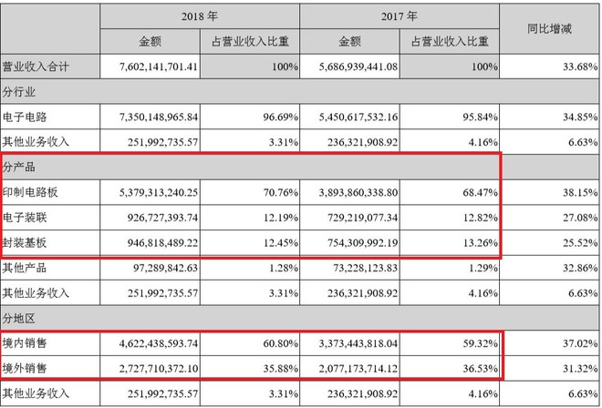 公司的主营业务是生产和销售印制电路板、封装基板、电 子装联三项业务,有点电子行业基础的人都知道,电子产品都有一块主板卡,上面集成了各种电子元器件和芯片。印制板是公司的主力产品,占总营收比例为70%左右。以下是主营收入构成。