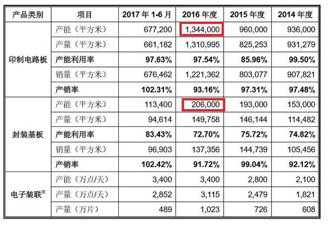 虽然上市后的2017年和2018年年报中均未再披露产能情况,但对比17年和16年资产负债表中的固定资产金额,并未发生太大变化,可以大致看出17年的产能只比16年略高,也就是印制电路板产能略高于134.4万平方米,封装基板略高于20.6万平方米。