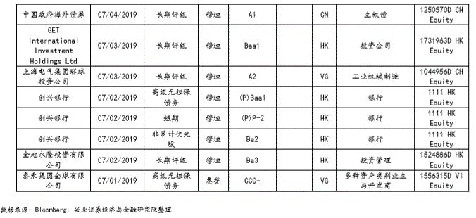 房地产行业的中资美元债利差整体走阔,月末环比上行74.55bp;而投资级与高收益级的利差则表现为上旬小幅攀升,下旬高收益利差收缩、投资级利差小幅波动。整体与分级之间的差异来源之一在于样本券中新增了2019年第二季度新发行的中资美元债,其中部分无评级房企的个券利差较大;其二,原有样本中的无评级主体“天津房地产集团有限公司(AP2686222)”信用资质承压,其发行的中资美元债于7月下旬出现价格的大幅调整,利差剧增影响曲线整体水平。因此,就下旬房地产利差表现整体看下来,7月12日发改委的778号文暂未引发房地产中资美元债二级市场的大幅波动,后续的政策影响是否发酵,从何路径发酵需要投资者加以持续关注。此外,就个体企业而言,7月负面信息影响了新城控股集团股份有限公司全资境外子公司新城环球有限公司、新城发展控股有限公司所发行中资美元债的价格大幅调整,新城控股集团股份有限公司所发行的境内债券价格也同样下跌,这类个券压力上行。同时,该负面冲击在当下并未大幅波及同行业同评级的其他发行主体的债券表现。