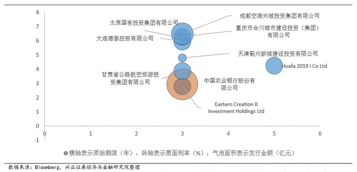 1) 发行规模中,房地产和城投债位于前二,合计占比超四成。本月共有20个行业发行新券,排名靠前的是房地产(76.5亿美元)、城投债(21.3亿美元)和金融服务(21.2亿美元)。