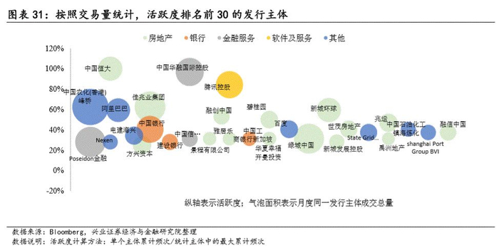 依据以上选取规则,并根据可获取的交易量数据统计,中国恒大是7月交易量最为活跃的中资美元债发行主体。从个体交易情况来看,中国农化(香港)峰桥有限公司和佳兆业集团交易规模较大。而就行业表现来看,活跃度排名前30的发行主体中,房地产企业占比五成,为交易最为活跃的美元债行业,其次,银行业和金融服务行业并列第二。而与上月相比,有6家企业新进入前30排名,包括Shanghai Port Group BVI Holding Co Ltd(运输与物流)、雅居乐集团(房地产)、电建海兴(工业其他)、中国信达金融(金融服务)、方兴资本(房地产)以及新城发展控股(房地产)。
