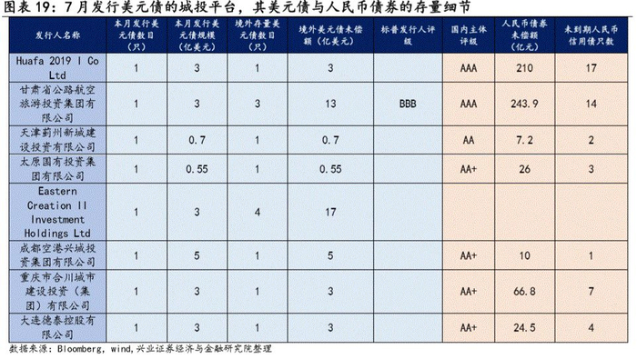 7月,城投平台共发行8只中资美元债,较6月小幅下降。7月的8只城投美元债规模21.3亿美元(6月58.42亿美元),分属8家发行主体。从细节来看,息票水平较为分散,最低值2.8%,最高值6.5%;期限则普遍集中,除了Huafa 2019 I Co Ltd发行的1只5年期债券外,其余债券均值在3年左右。评级方面,除Eastern Creation II Investment Holdings Ltd(A)和甘肃省公路航空旅游投资集团有限公司(BBB)发行的债券有评级,其余城投美元债均无评级;同时,对标后发现主体国内评级表现分化,其中AAA等级2家、AA+等级4家、AA等级1家,其余1家暂无国内主体评级。