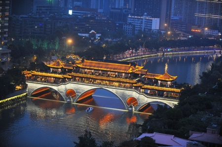 在许多拍客眼里,成都的夜景比邻居重庆差了一大截——夜幕中,大山城的建筑、桥梁、街道、船坞等斑斓梦幻而有层次,五彩光晕爬过高峦低岸漫漶出流水般的韵致;“一马平川”的成都则显单调,平铺直叙的星光像是飞播的种子均匀生长出来的,又如阴霾天一个颜值庸常的女子乏善可陈;幸好成都有一座安顺廊桥,这种局部之美弥补了成都夜景地理上的先天不足。