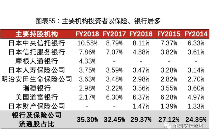 股息2-3%类债券股,机构投资者以保险、银行为主。YAMATO稳定的业绩与分红,受到保险和银行喜欢,其前十大流动股东中有5家银行、3家保险,银行及保险公司持股占总流通股比重逐年提升,2018财年达到35.3%。