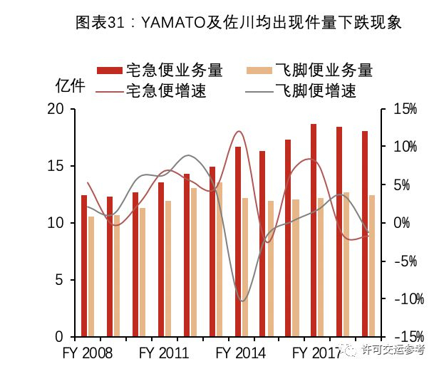业务量出现停滞:在需求繁荣的同时,日本快递巨头却出现了停滞,佐川在经历了2013财年的下滑后,业务量基本不再增长。YAMATO2018财年件量也开始滑坡。这与我国电商件需求及电商快递供给同时繁荣的情况大相径庭。