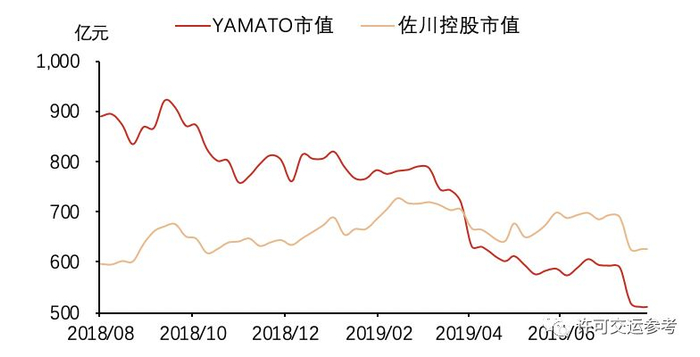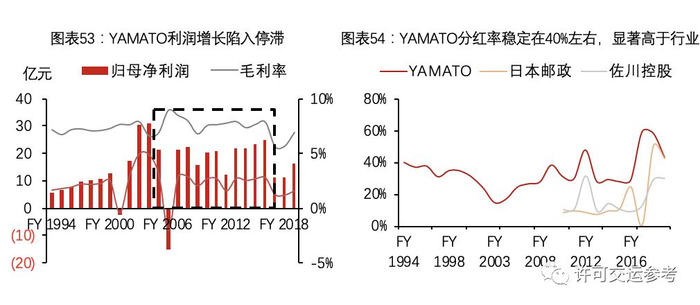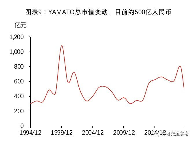 YAMATO1949年于东京交易所上市,泡沫时期总市值曾短暂达到过1000亿人民币,目前总市值仅500亿人民币水平左右,不及韵达股份。百年发展历史、龙头市场地位与其利润水平、市值规模形成强烈反差。